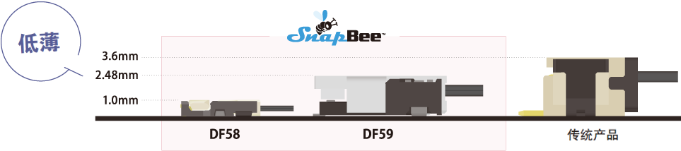 支持28 AWG,高度1.0mm,是业内最低薄级别的小型连接器。DF58系列是SnapBee中在低薄构造和窄间距方面最具优势的产品,有助于实现机器设备的小型化。较大的有效嵌合长度可以实现稳定的连接。